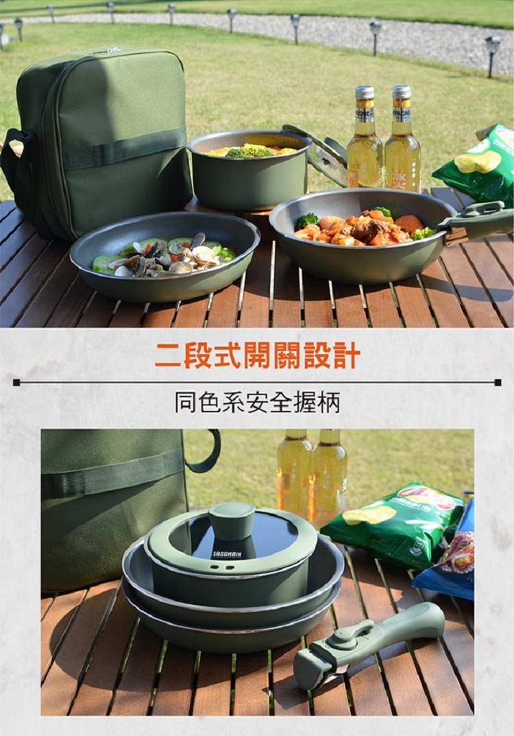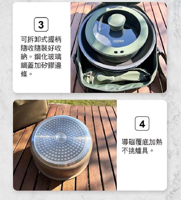 材質 : 鍋體-鋁合金 / 塗層-日本Daikin / 湯鍋蓋-鋼化玻璃+矽膠護邊 / 方形收納袋 - polyester聚酯纖維