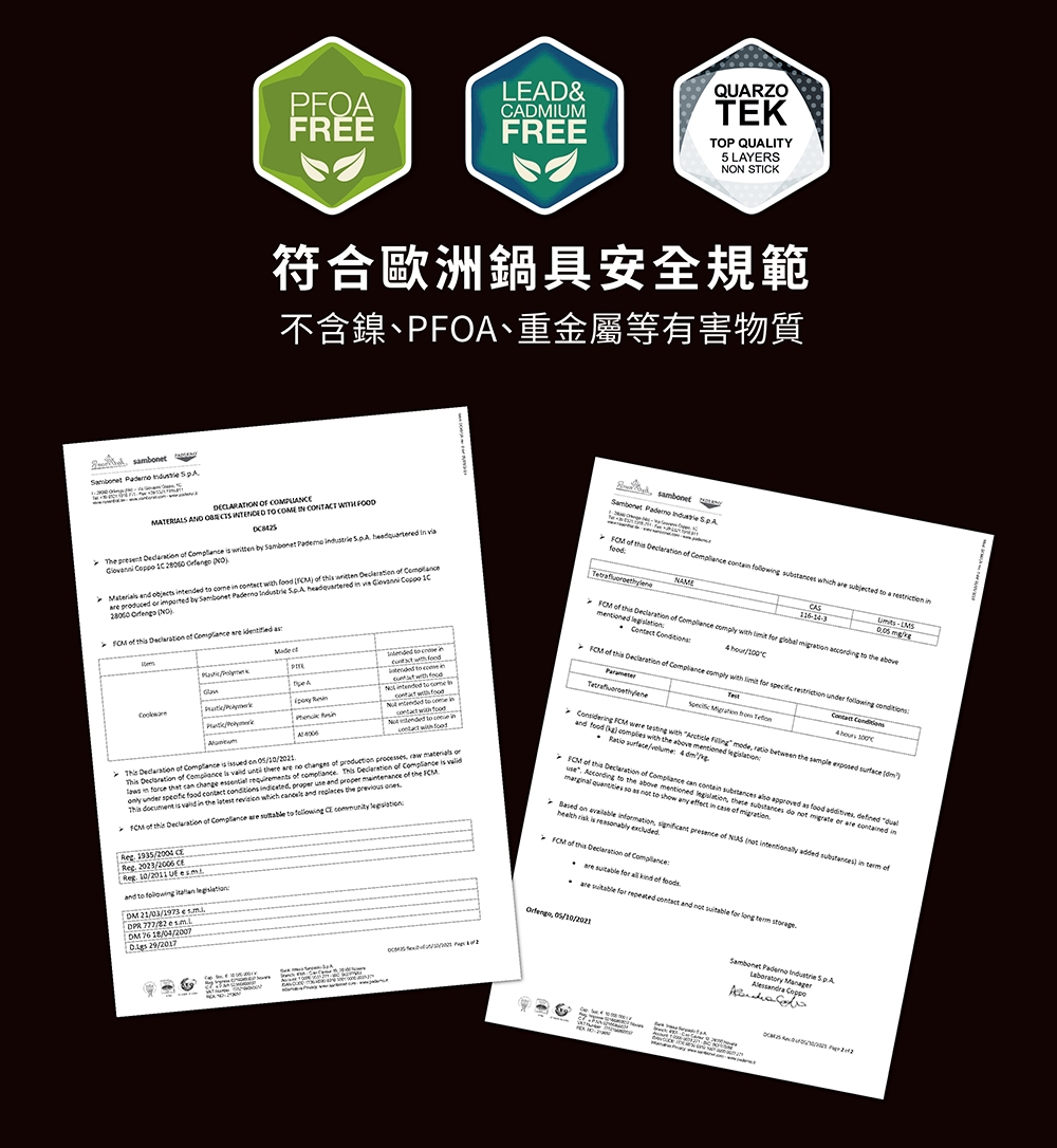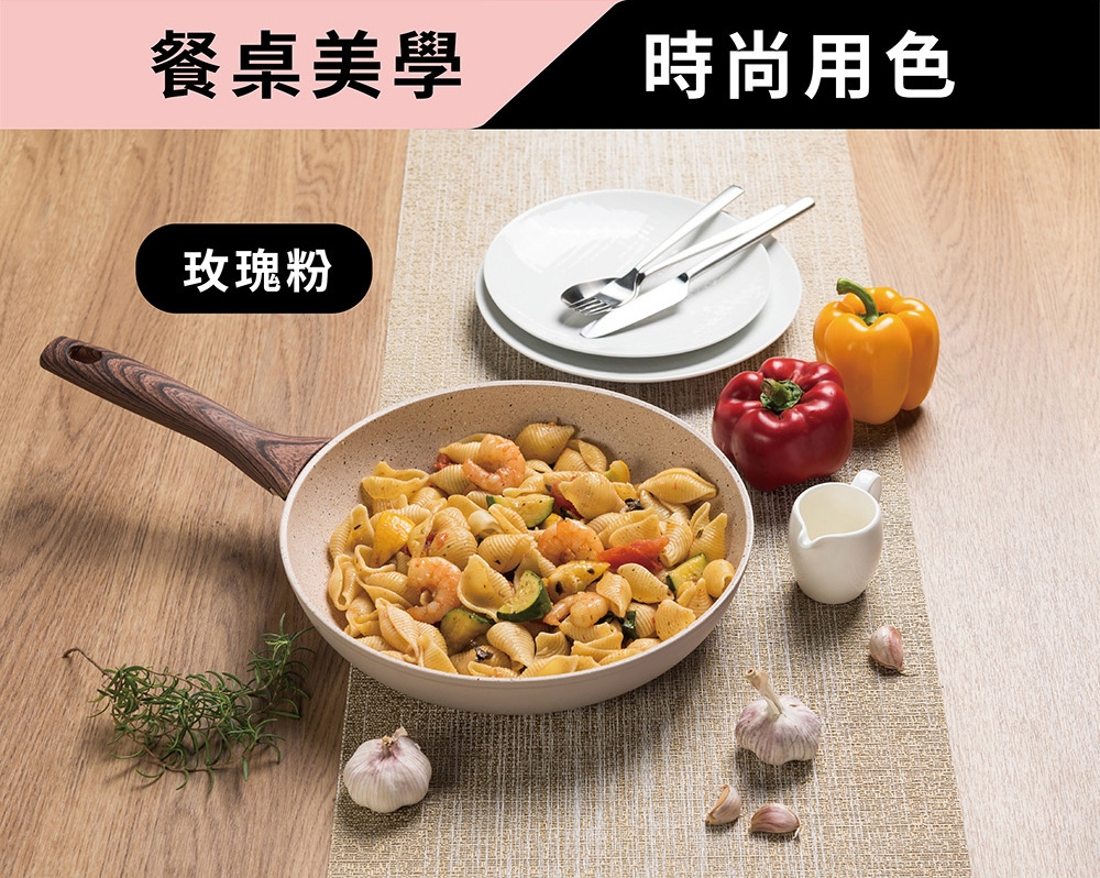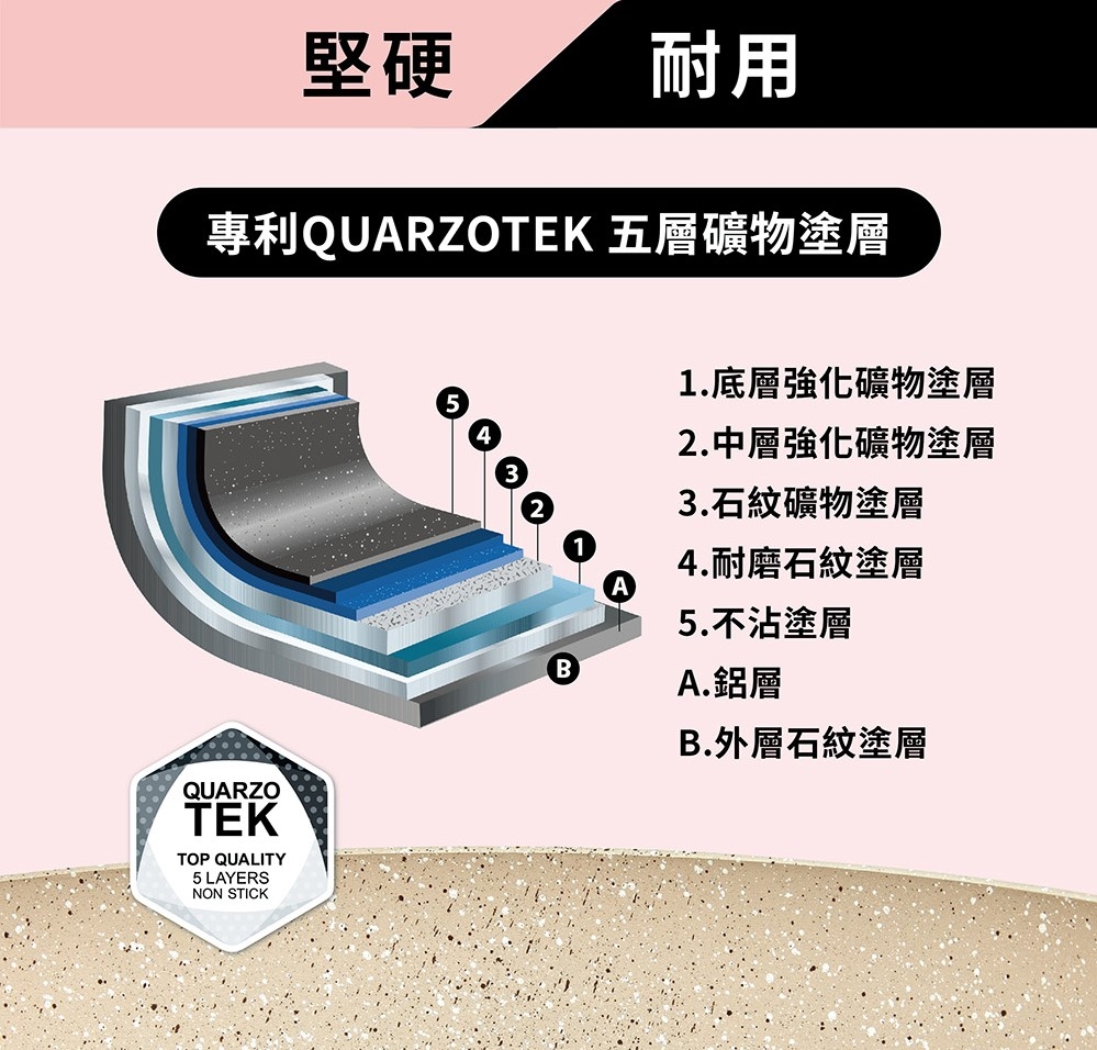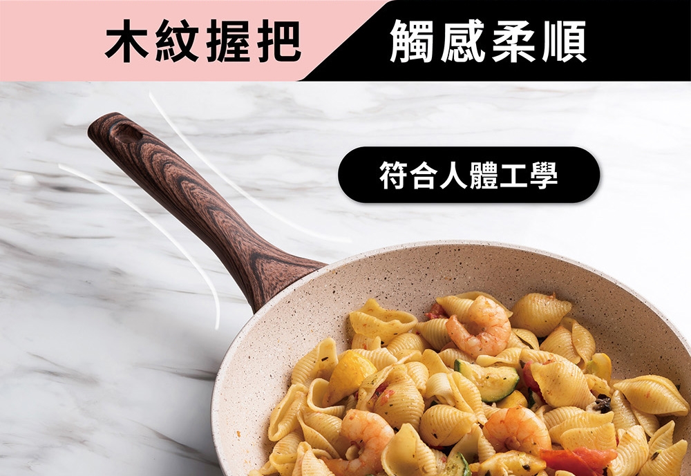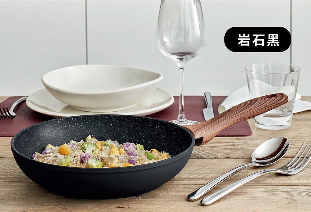 材質:本體 / 鋁/QUARZOTEK五層礦物不沾塗層(符合歐洲鍋具安全規範,不含鎳、PFOA、重金屬等有害物質) + 電木把手(木紋) / 酚醛樹脂