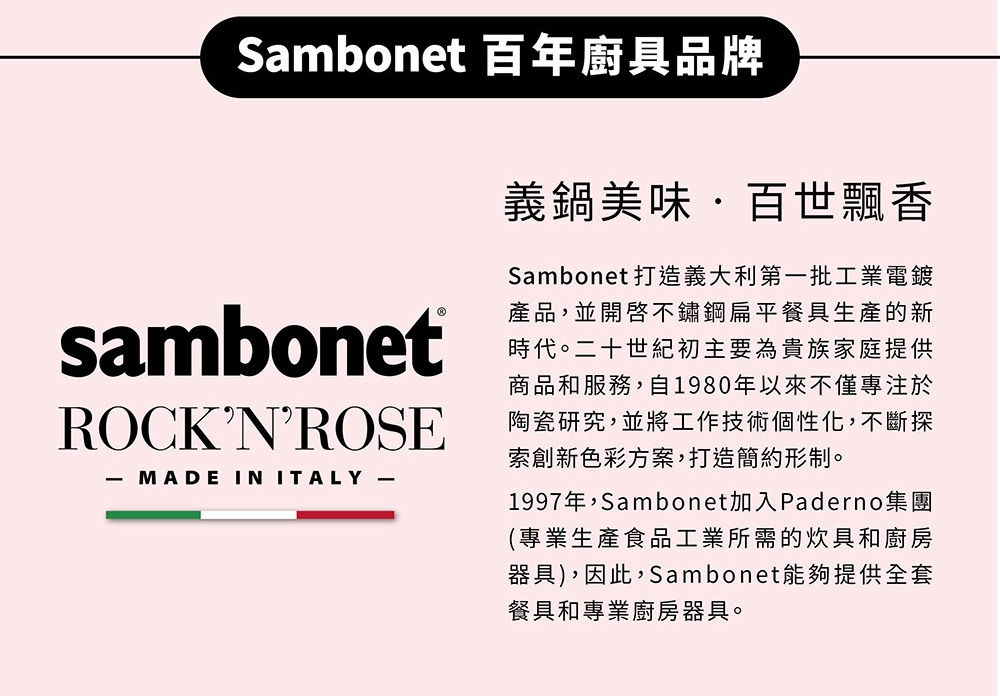 Sambonet打造義大利第一批工業電鍍產品,並開啓不鏽鋼扁平餐具生產的新時代。二十世紀初主要為貴族家庭提供商品和服務,自1980年以來不僅專注於陶瓷研究,並將工作技術個性化,不斷探索創新色彩方案,打造簡約形制。1997年,Sambonet加入Paderno集團(專業生產食品工業所需的炊具和廚房器具),因此,Sambonet能夠提供全套餐具和專業廚房器具。