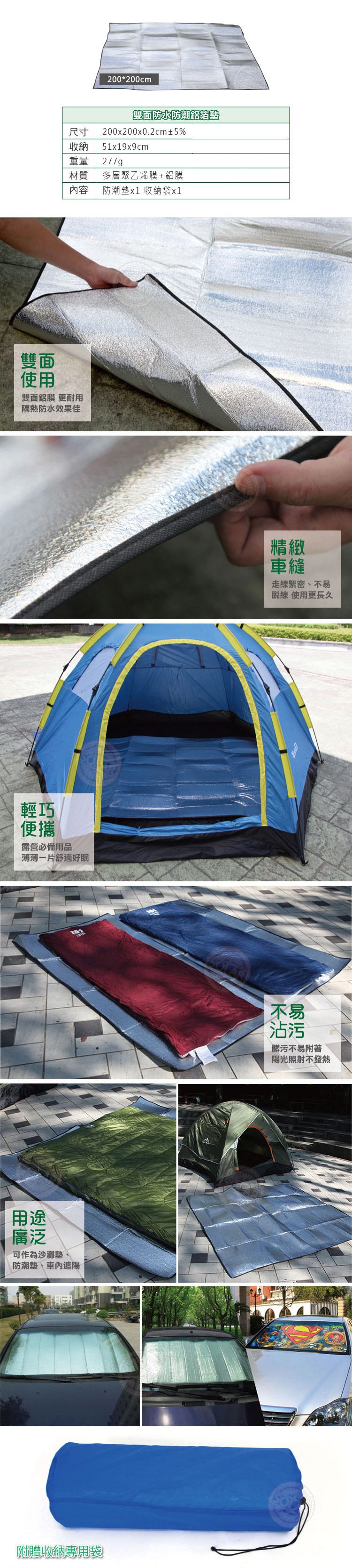 尺寸 200 x 200 x 0.2 cm 收納 51 x 19 x 9 cm 重量 227 g 材質 多層聚乙烯膜 + 鋁膜 內容 防潮墊 x 1 + 收納袋 x 1