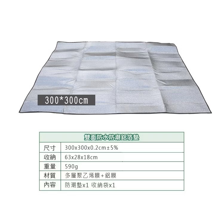 尺寸 300 x 300 x 0.2 cm 收納 63 x 28 x 18 cm 重量 590 g 材質 多層聚乙烯膜 + 鋁膜 內容 防潮墊 x 1 + 收納袋 x 1