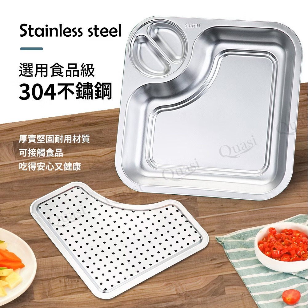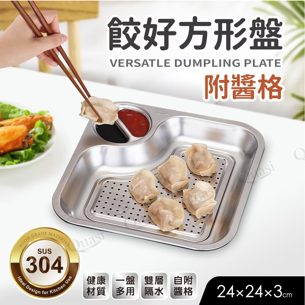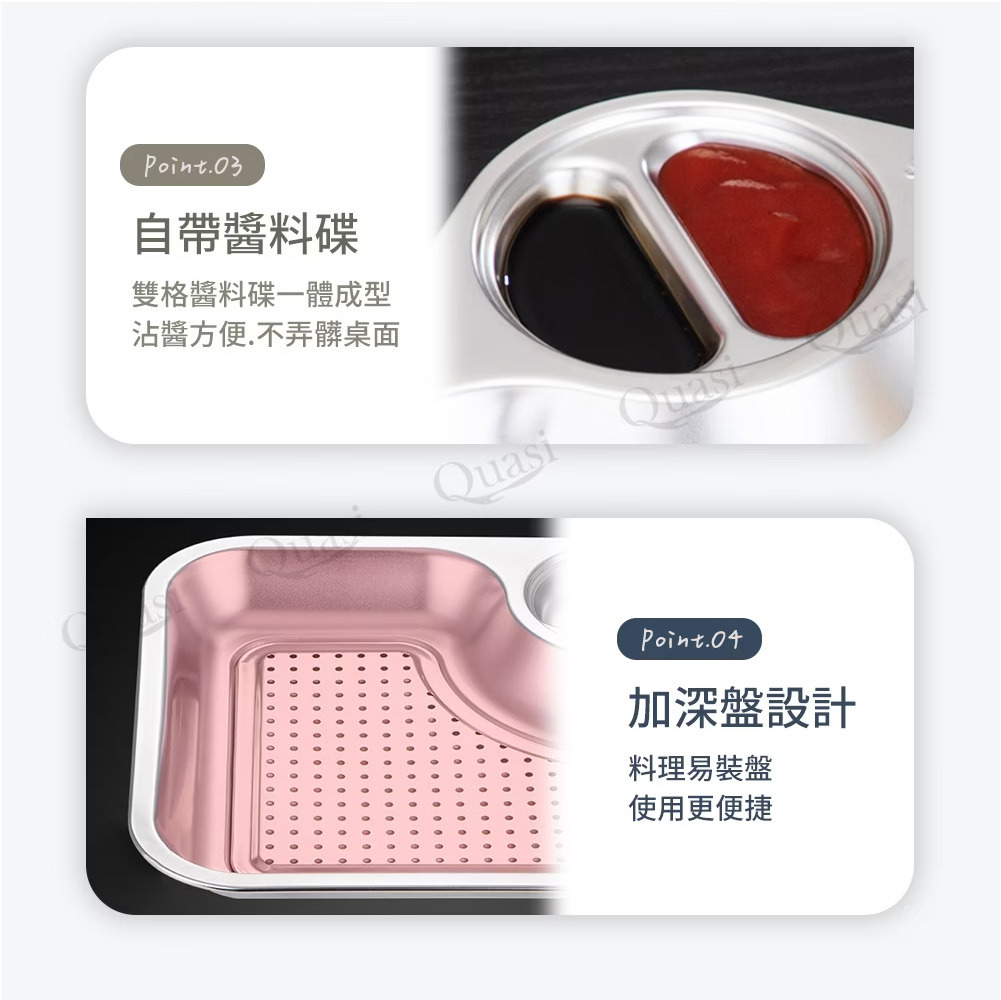 雙格醬料碟與不鏽鋼盤一體成型.沾醬輕鬆.不易沾滴桌面