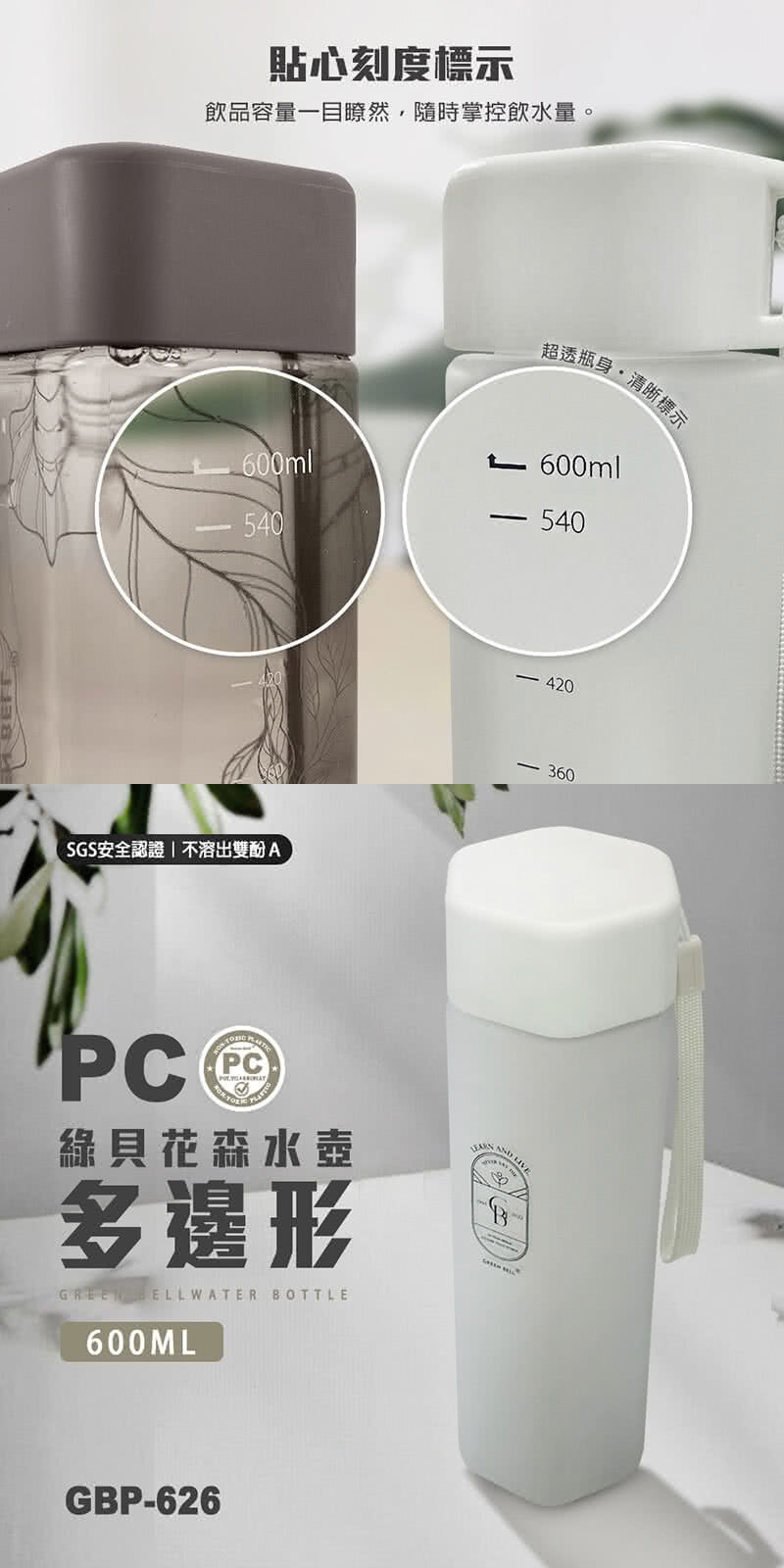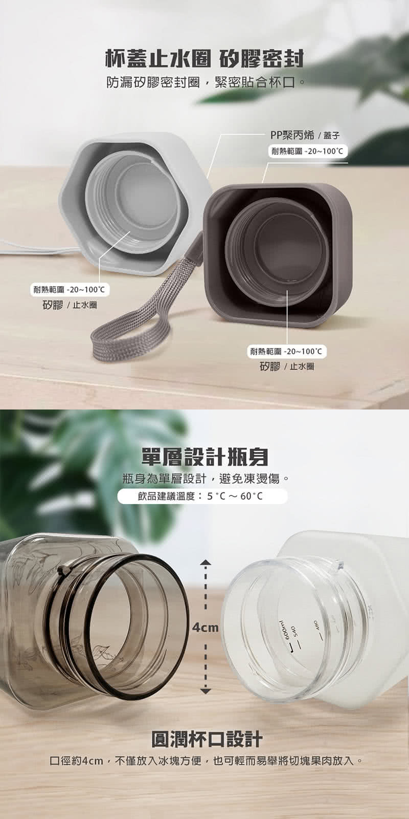尺寸:直徑約6.3cm / 高約20.5cm / 口徑約4cm 材質: 瓶身 / 改質PCT-Tritan(耐溫-10℃∼100℃) 瓶蓋 / PP聚丙烯(耐溫-20℃∼100℃) 止水圈 / 矽膠(耐溫-20℃∼100℃) 提繩 / 滌綸 容量:600ml ±5% 重量裸品:約120g ±5% 產地 : 中國