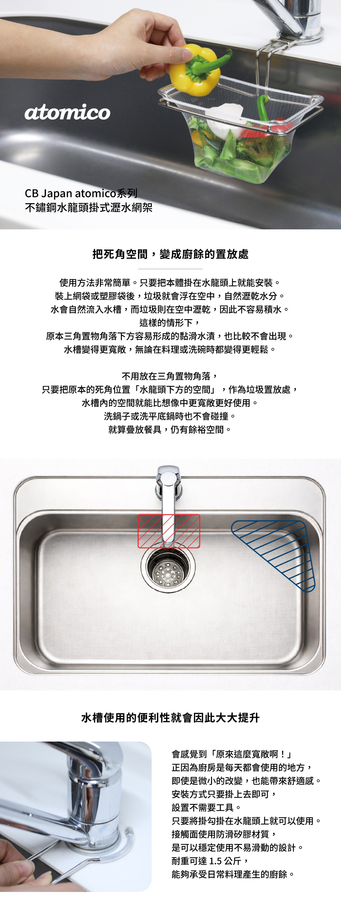 此款不鏽鋼水龍頭掛式瀝水網架只需掛在水龍頭上即可輕鬆安裝使用,無需任何工具或繁瑣準備。