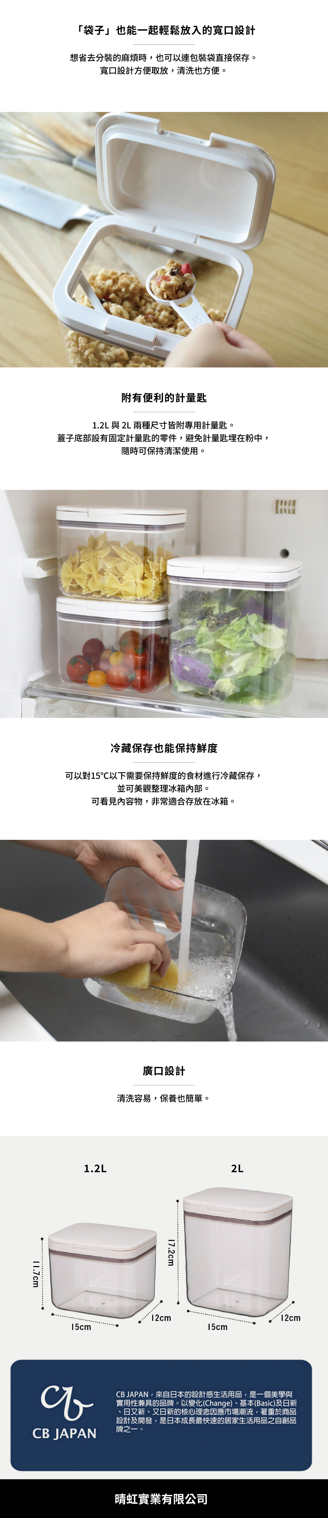 共有 1.2L 與 2L 兩種尺寸,均附有便利的計量匙,計量匙可收納在蓋子底部,可避免遺失或弄髒。