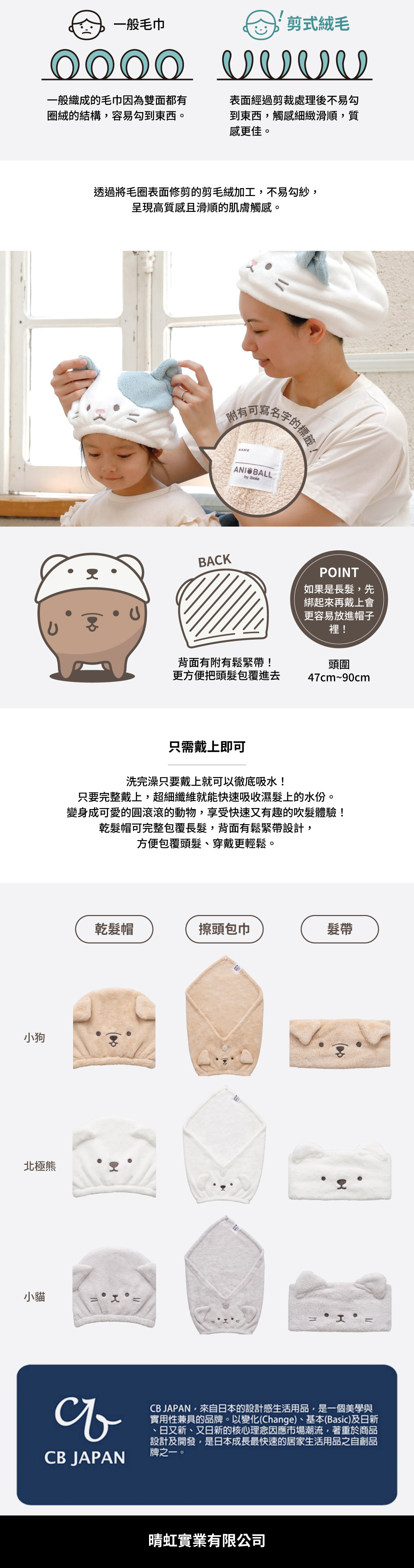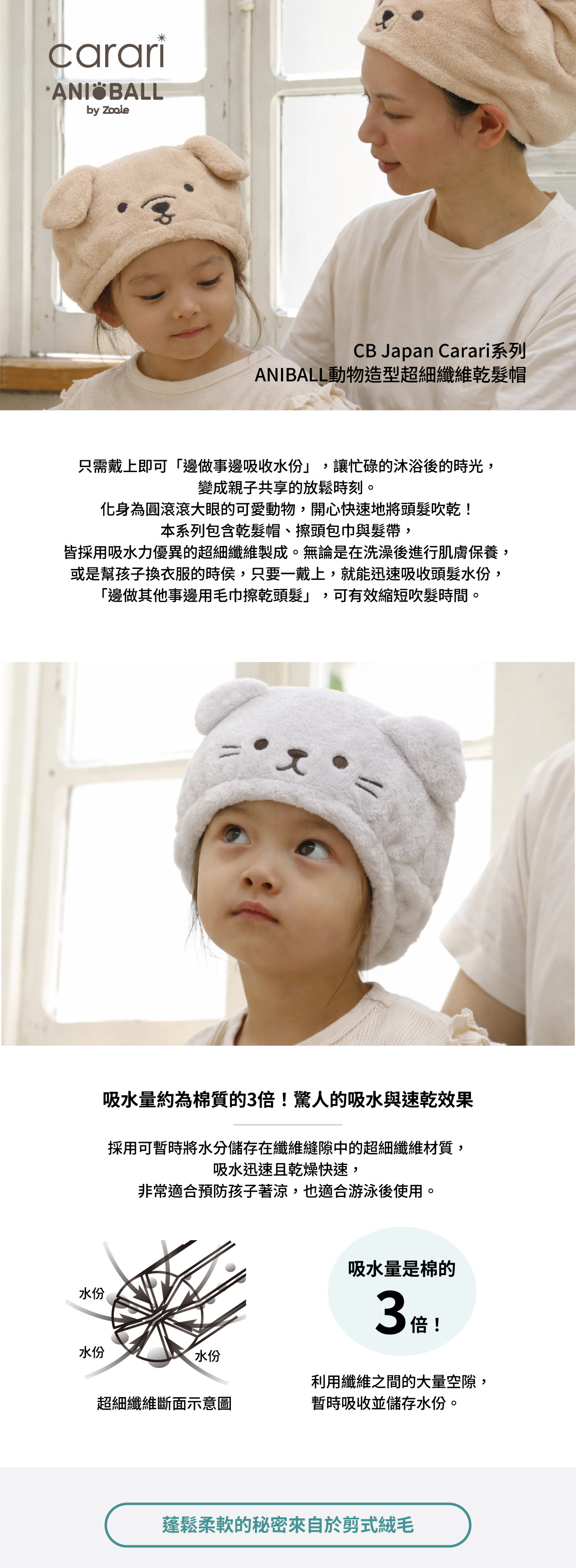 採用吸水力約為棉質3倍的超細纖維,可迅速吸收濕髮水份,縮短吹髮時間。滑順細緻的剪絨加工,帶來極佳觸感。提供乾髮帽、擦頭包巾與髮帶三種款式,非常適合在保養肌膚或替孩子換衣時使用的「邊做事邊吸收水份」設計。附有便利姓名標籤,也非常推薦游泳場合使用。