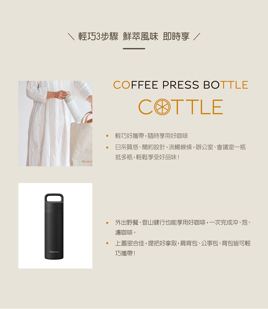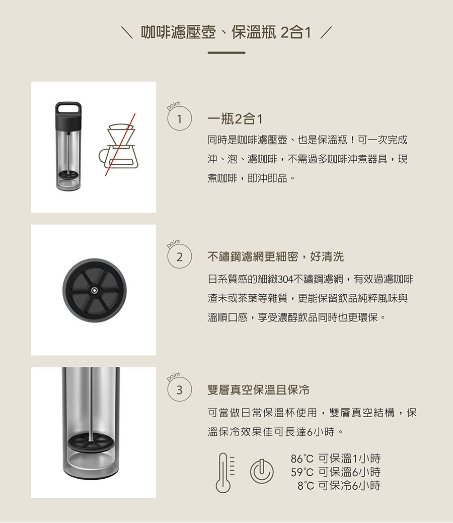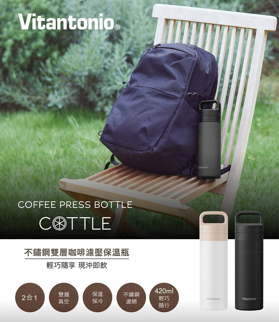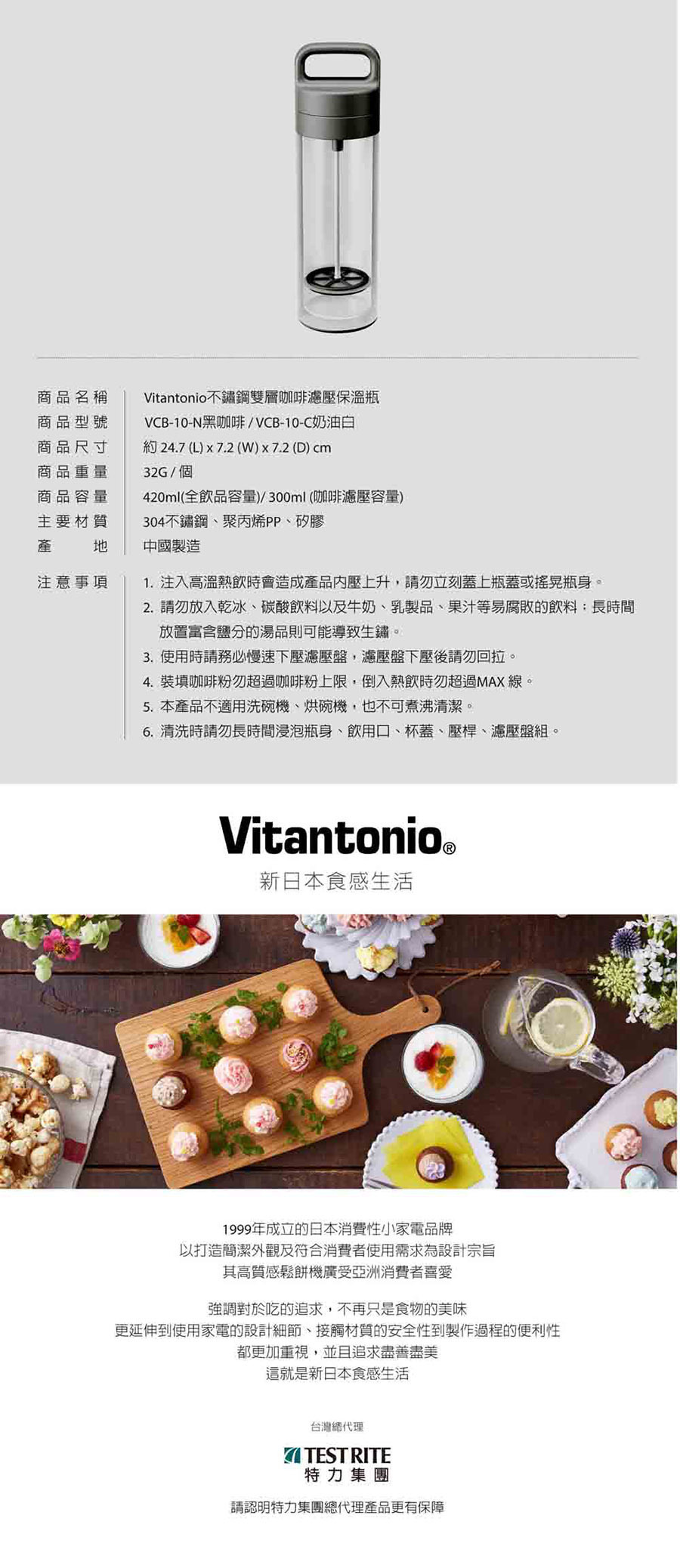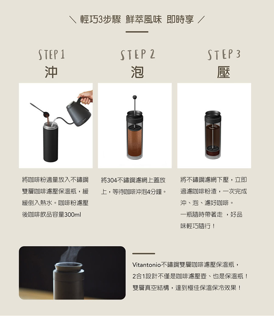 現貨出清42折|日本Vitantonio 不鏽鋼雙層咖啡濾壓保溫瓶-黑咖啡