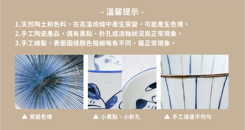 1.陶瓷製品,請小心拿取並輕放;盛裝熱食/飲時,請小心燙手及燙口。