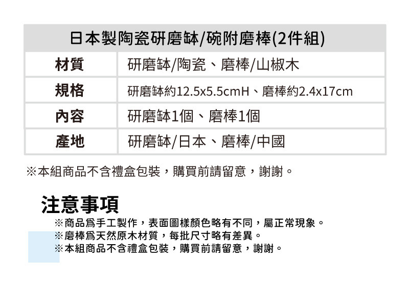 ※磨棒為天然原木材質,每批尺寸略有差異。