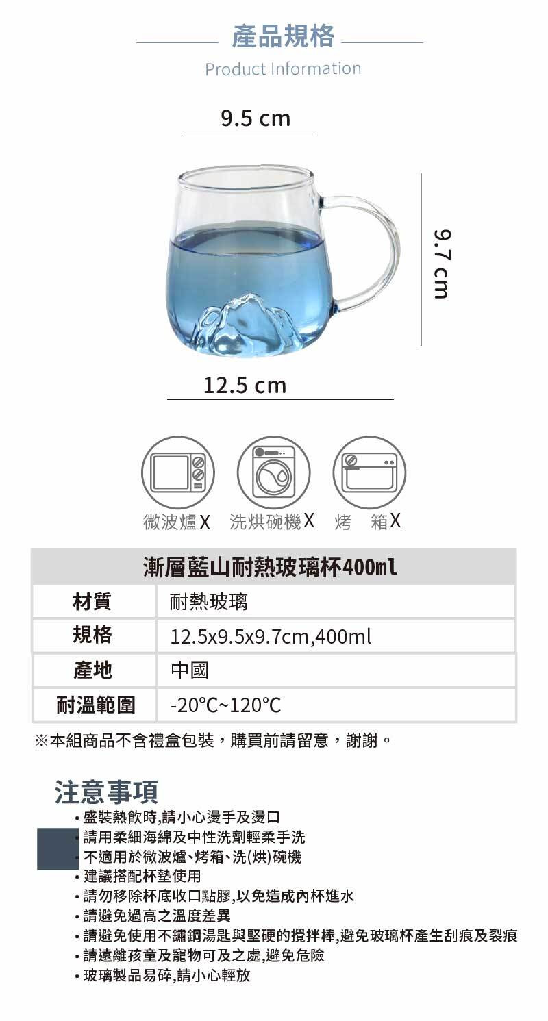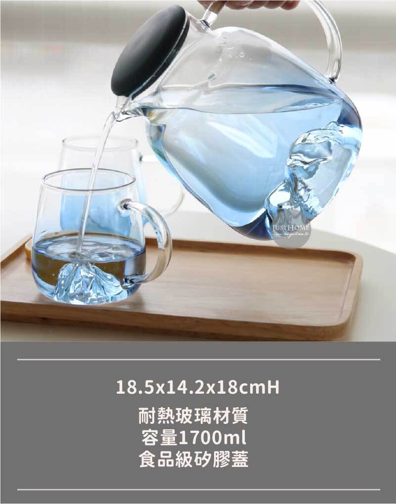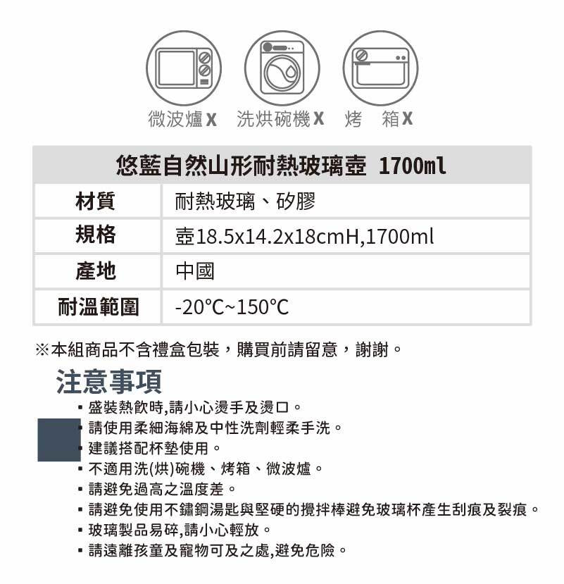 材質:耐熱玻璃、矽膠 耐溫範圍:-20℃~150℃ 規格:茶壺18.5x14.2x18cmH,1700ml;玻璃杯約6.5x13.5cmH,400ml 產地:中國 ※本組商品不含禮盒包裝,請留意。 【注意事項】 ☆盛裝熱飲時,請小心燙手及燙口。 ☆請使用柔細海綿及中性洗劑輕柔手洗。 ☆建議搭配杯墊使用。 ☆不適用洗(烘)碗機、烤箱、微波爐。 ☆請避免過高之溫度差。 ☆請避免使用不鏽鋼湯匙與堅硬的攪拌棒避免玻璃杯(壺)產生刮痕及裂痕。 ☆玻璃製品易碎,請小心輕放。 ☆請遠離孩童及寵物可及之處,避免危險。