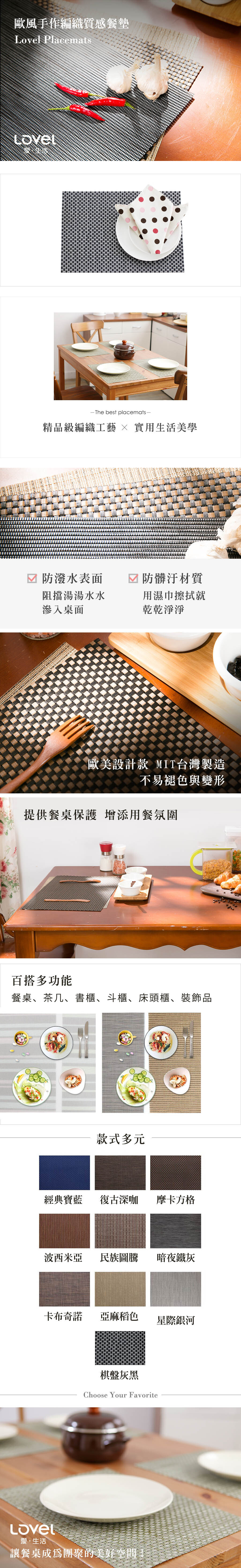 材質:PVC 尺寸:長45,寬30(± 5cm) 重量:100g 產地:台灣 【使用說明與注意事項】 1. 請勿使用洗碗機,勿熨燙或烘乾 2. 以濕布、海綿或肥皂水擦拭,自然風乾即可 3. 盡量平放收納,勿將餐墊折疊