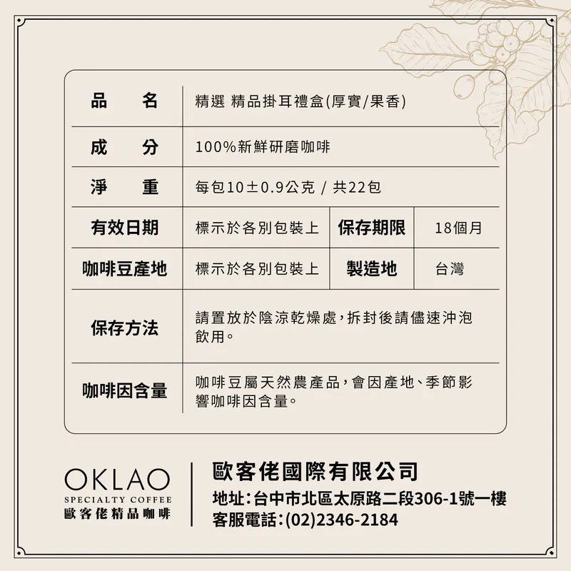 ➋精品掛耳咖啡和浸泡式咖啡的外包裝上,保存期限標示為18個月,但因每款商品銷售量不一定,您收到的部分商品有可能會在14個月以內賞味期,若無法接受請勿下單!