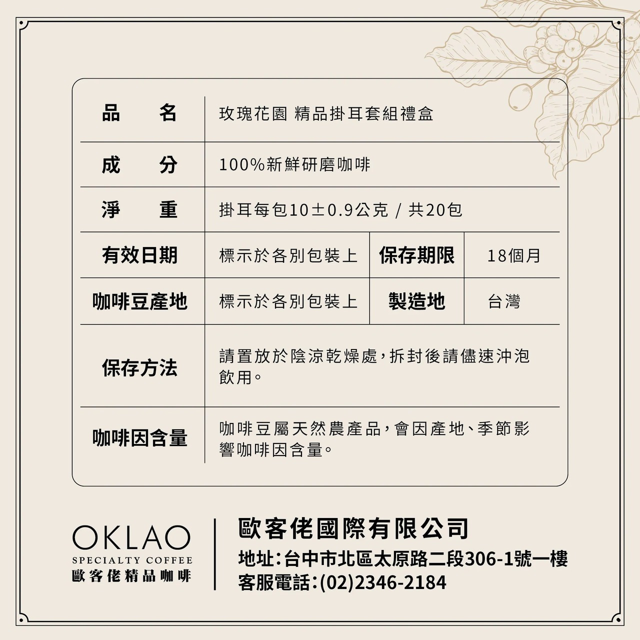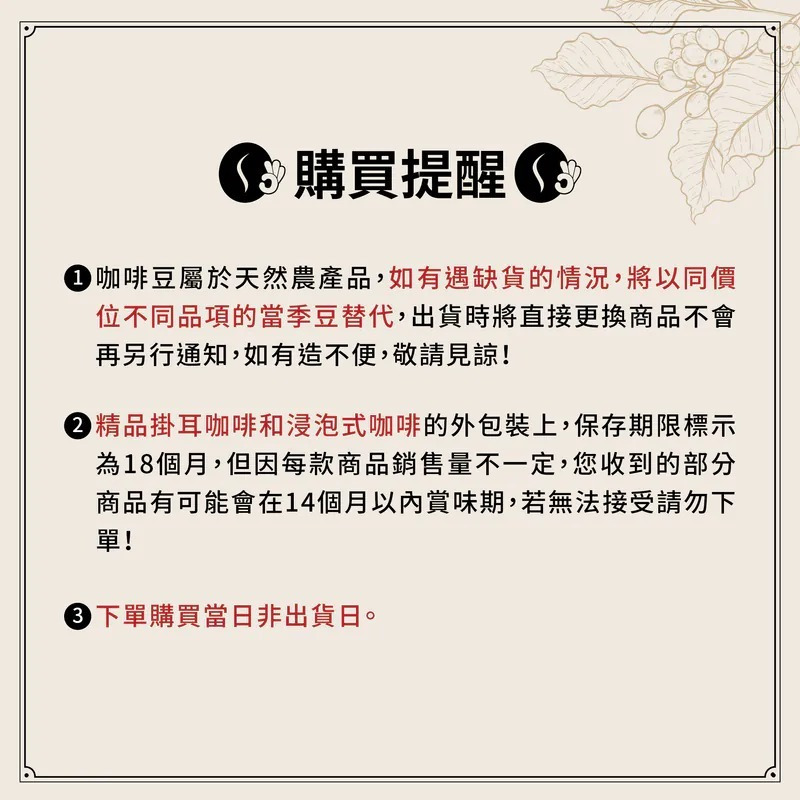 ➋精品掛耳咖啡和浸泡式咖啡的外包裝上,保存期限標示為18個月,但因每款商品銷售量不一定,您收到的部分商品有可能會在14個月以內賞味期,若無法接受請勿下單!