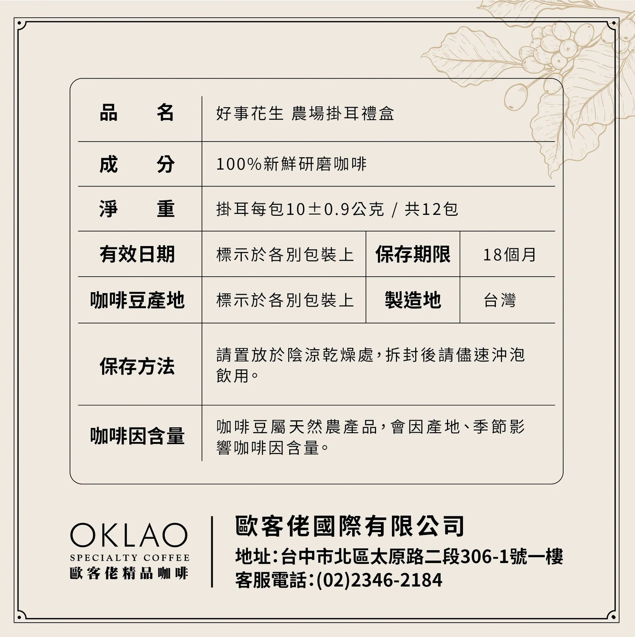 ➋精品掛耳咖啡和浸泡式咖啡的外包裝上,保存期限標示為18個月,但因每款商品銷售量不一定,您收到的部分商品有可能會在14個月以內賞味期,若無法接受請勿下單!