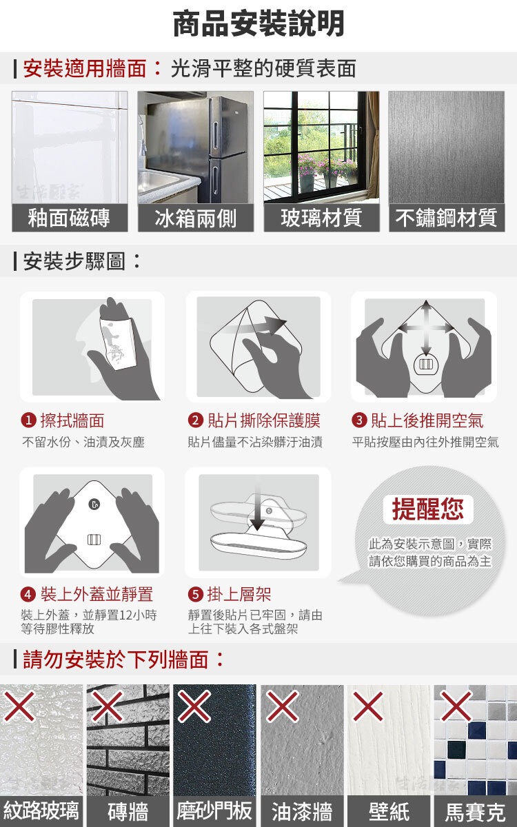 1.安裝前請務必將牆面擦拭乾淨並保持乾燥,避免灰塵或水氣影響黏著。