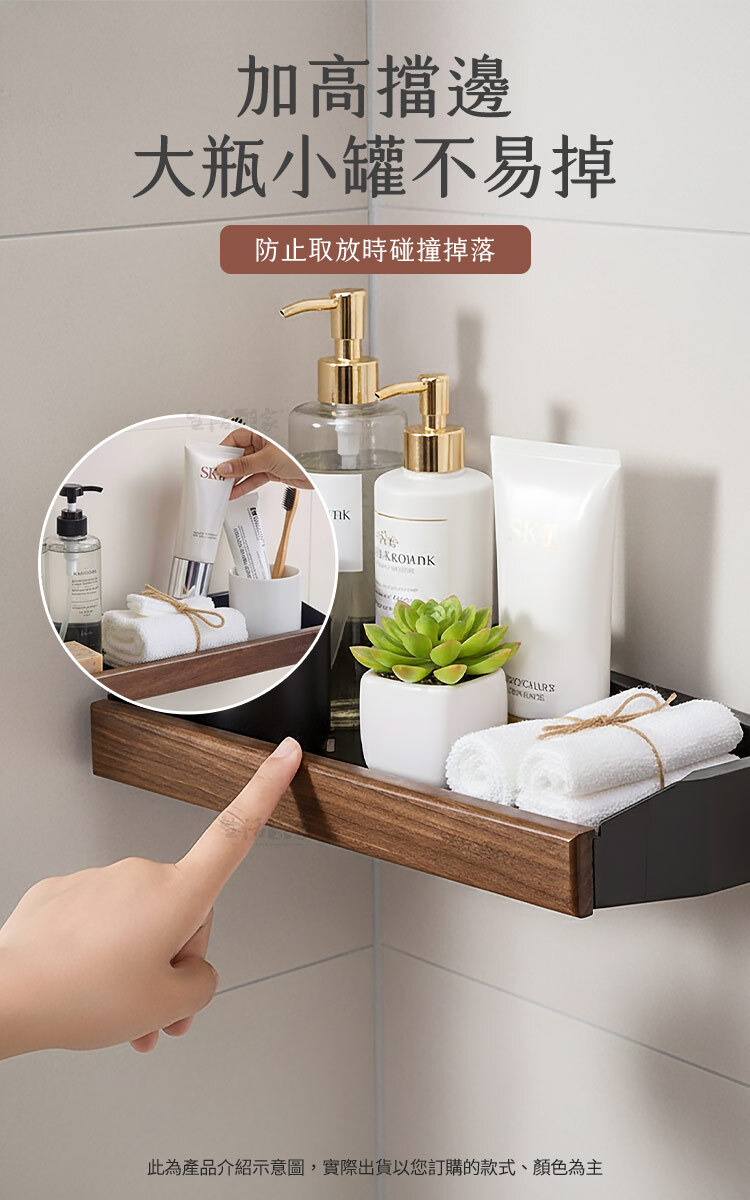 ․加高擋邊:有效防止拿取或放置物品時碰撞滑落,特別適合高瓶身的沐浴乳或洗髮精。