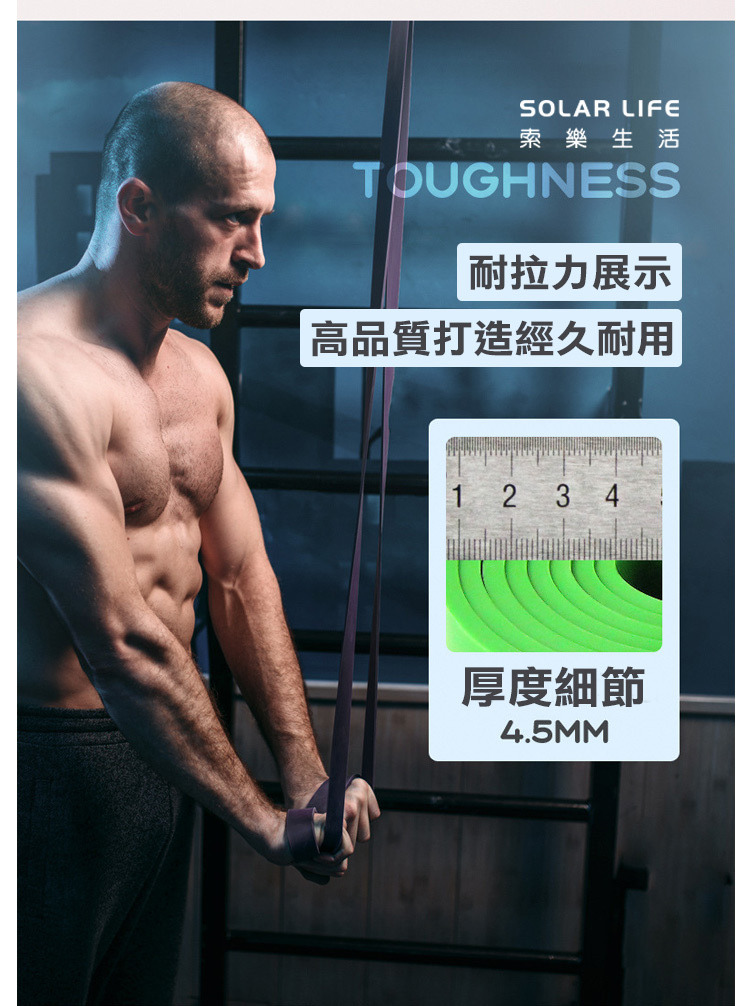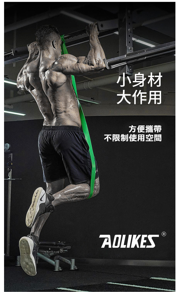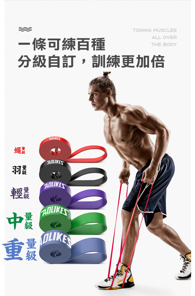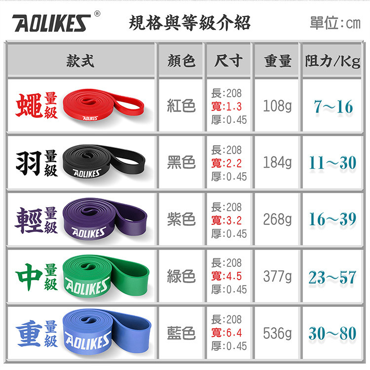 品名:AOLIKES 重訓健身瑜珈彈力拉力帶 尺寸:長 208 cm / 厚 0.45 cm 紫 - 寬 / 重量 / 阻力:3.2 cm / 268 g / 16-39 kg 綠 - 寬 / 重量 / 阻力:4.5 cm / 377 g / 23-57 kg 材質:天然乳膠 內容:彈力拉力帶 x 1