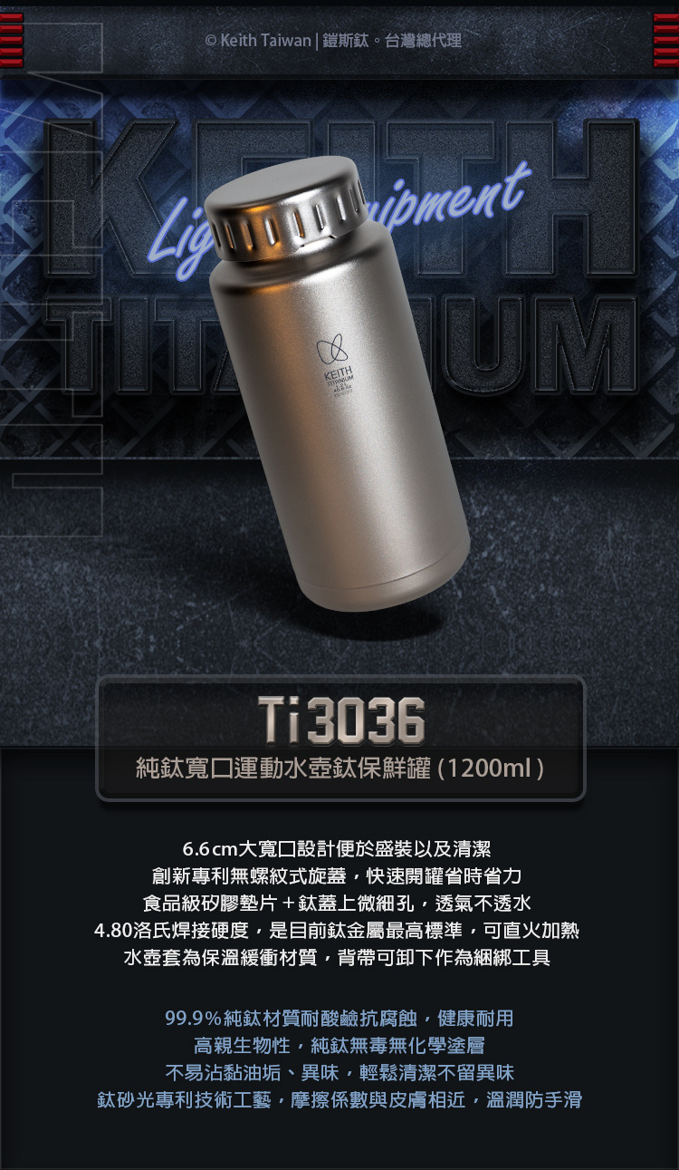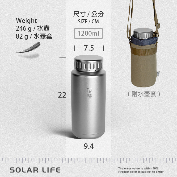品名:鎧斯鈦寬口運動水壺鈦保鮮罐 1200ml 附可拆背帶水壺包 / Ti3036 尺寸:水壺7.5 x 22 x 9.4cm / 1200ml 、水壺套18.5 x 9.5cm 重量:水壺246g、水壺套82g 包裝:11 x 11 x 24cm / 380g 款式:單一款式 材質:純鈦、食品級矽膠 產地:中國 內容:鈦水壺 x 1、水壺套 x 1