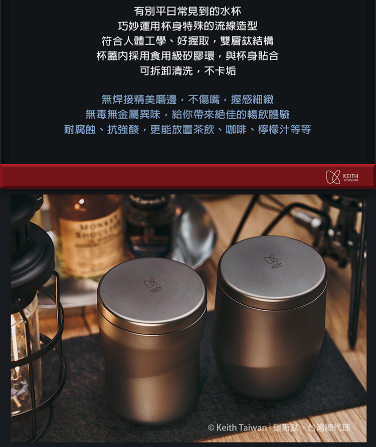 品名:Keith 鎧斯鈦銀河雙層保溫杯 220ml / Ti3312 尺寸:ø7.5 x 10cm 重量:115g 容量:220ml -------------------------------------------------- 材質:99.9%純鈦+矽膠 表層: 砂光 顏色: 鈦金屬原色 -------------------------------------------------- 型號:Ti3312 款式:單一款式 內容:保溫杯 x 1